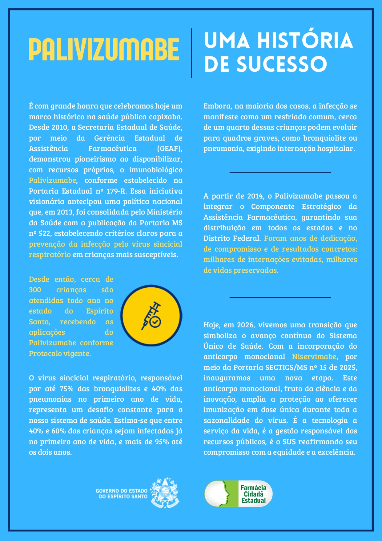 No Estado do Espírito Santo, os critérios de utilização do Palivizumabe seguem as orientações do Ministério da Saúde uma vez que este órgão é responsável pela aquisição e distribuição do medicamento aos estados da federação, através do Componente Estratégico da Assistência Farmacêutica (Cesaf). Para descrição e organização do fluxo de acesso ao Palivizumabe pelo SUS, é lançada anualmente uma Nota Técnica com o detalhamento para profissionais de saúde e usuários. Segue link abaixo da Nota Técnica referente a Sazonalidade de 2026: